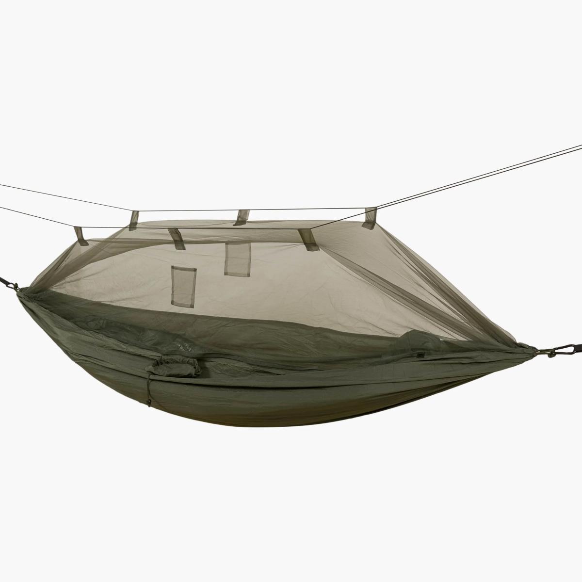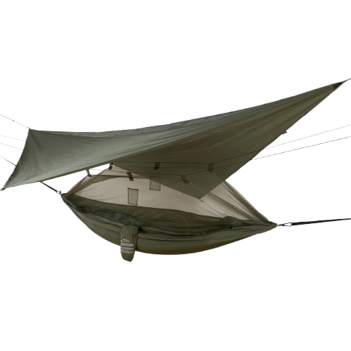 Le hamac Crusader est conçu pour offrir une nuit confortable en plein air, tout en assurant une protection efficace contre les insectes et la pluie. Il est équipé d’une moustiquaire intégrée et d’une bâche imperméable surélevée, formant un ensemble complet pour dormir en hauteur, à l’abri des éléments.